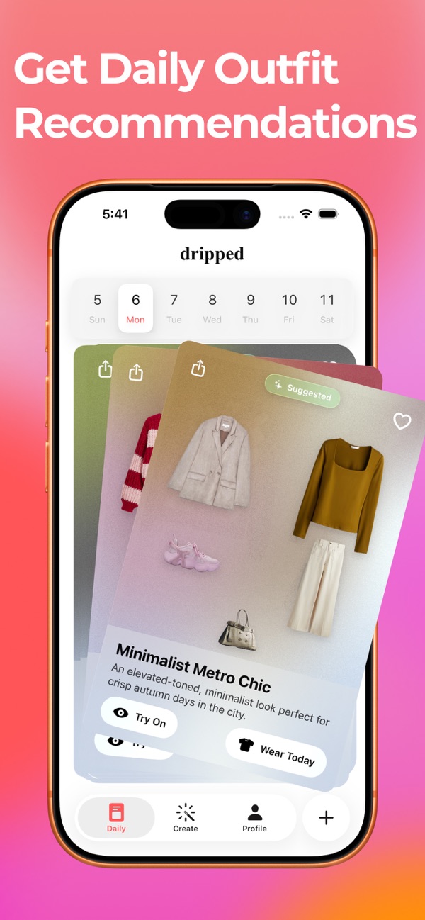 Dripped is your AI-powered digital closet and outfit planner. Organize your wardrobe, get daily outfit suggestions based on weather and calendar, and virtually try on looks before getting dressed. Finally make peace with your closet.