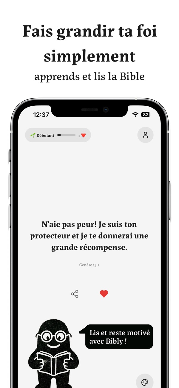 Bibly est ton compagnon spirituel quotidien. Découvrez chaque jour des versets bibliques, des promesses divines, des mots en hébreu et grec ancien, des défis spirituels et des questions de réflexion pour approfondir ta foi. TA FOI AU QUOTIDIEN Parcoure une sélection de plus de 500 contenus spirituels soigneusement choisis.