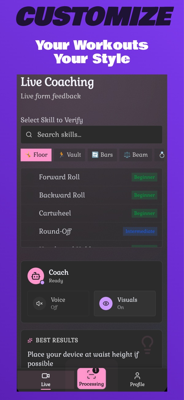 Gymnastics AI Coach CheckForm is an AI-powered gymnastics training app that helps gymnasts improve faster with instant form analysis and personalized feedback. Train with a personal AI gymnastics coach that is always available. ON-DEVICE AI GYMNASTICS TRAINING CheckForm analyzes gymnastics technique directly on your device using AI pose detection and biomechanical analysis.