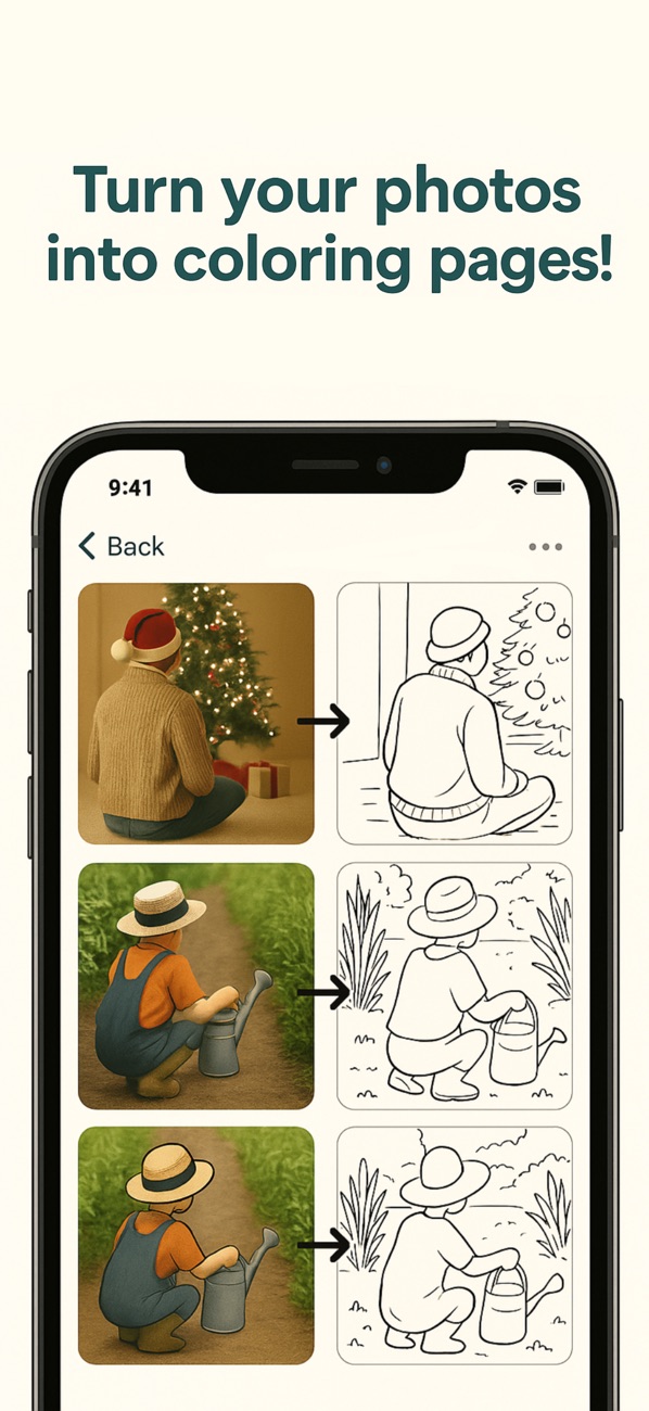 Turn your favorite moments into black and white coloring pages with just a tap. Whether it’s a picture of your pet, a family photo, a beautiful landscape or a selfie — this app transforms your own images into printable drawings you can color. Perfect for kids, relaxing afternoons, or creative gifts, this app brings your memories to life in a whole new way.