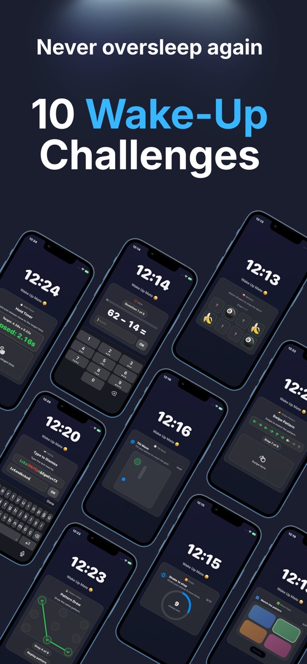 An alarm you can’t ignore. To turn it off, beat a mini-game. Perfect for heavy sleepers: shake, math, memory, patterns, typing, and more.