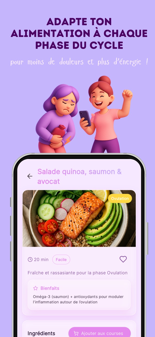 Lunea t’aide à mieux manger en respectant le rythme de ton corps. Découvre des recettes faciles, délicieuses et adaptées à chaque phase de ton cycle. Planifie ta semaine, fais tes courses en 2 tap, et reçois des conseils doux pour te sentir bien—sans charge mentale.