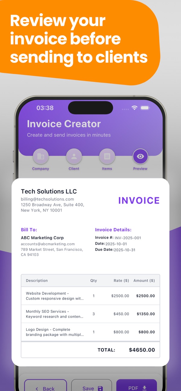 Invoices Maker : BillMaster Create stunning, professional invoices in seconds right from your phone. Perfect for freelancers, small business owners, and entrepreneurs who need quick and easy invoicing on the go. KEY FEATURES: - Lightning Fast - Create complete invoices in seconds with our intuitive interface - Professional Templates - Beautiful, customizable invoice designs that impress clients - Complete Customization - Add your company logo, details, and branding - Client Management - Save client information for faster future invoicing - Flexible Item Management - Add unlimited items, quantities, and prices - Multi-Currency Support - Invoice in USD and other major currencies - Preview & Export - Review your invoice before sending and export in multiple formats - Step-by-Step Workflow - Simple guided process from company details to final invoice PERFECT FOR: - Freelancers - Consultants - Small Business Owners - Contractors - Service Providers - Anyone who needs professional invoices quickly WHY CHOOSE INVOICE CREATOR ?