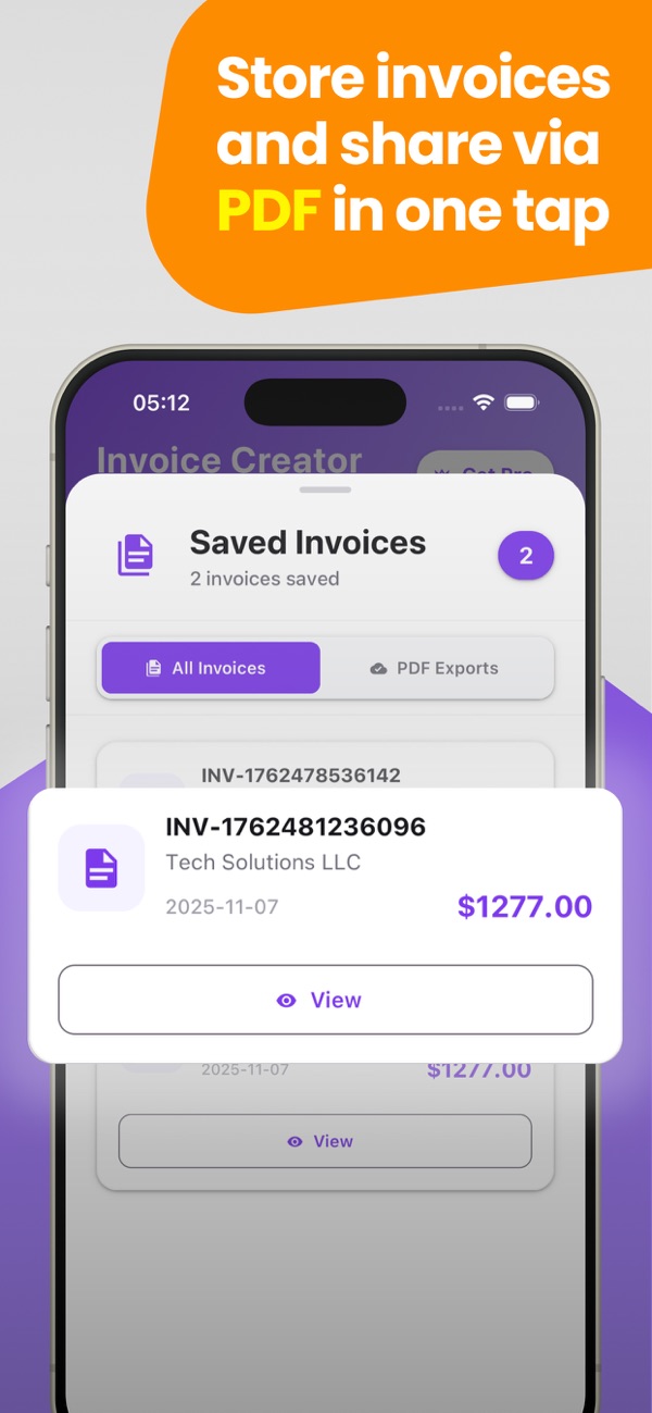 Create professional e-invoices in seconds. Your invoices are automatically generated in PDF format and stored securely on our servers. Access all your invoices instantly, anytime, anywhere.