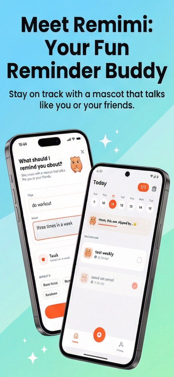 Meet Remimi, your tiny reminder buddy. Remimi turns boring reminders into friendly nudges that help you stay consistent, focused, and stress-free. No pressure.