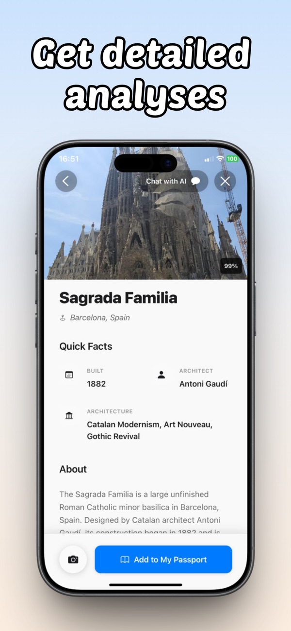 Instantly identify buildings, statues & art with AI. Discover hidden gems, learn the history behind landmarks, and turn your camera into a smart travel guide. ".