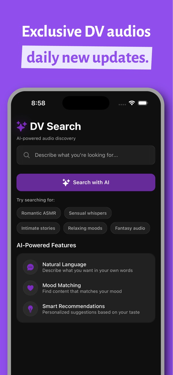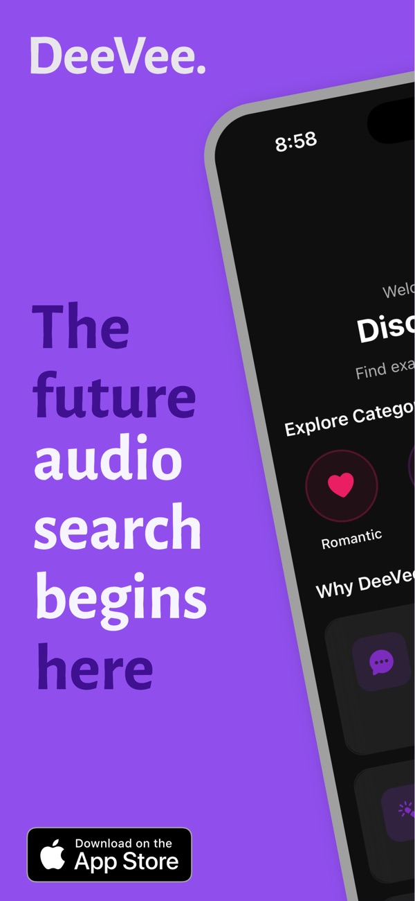 Discover your next favorite audio story with DeeVee the AI-powered search engine designed for audio content lovers. DeeVee uses advanced artificial intelligence to understand what you're looking for and matches you with the perfect audio content. Whether you're in the mood for something romantic, mysterious, relaxing, or intense just describe it in your own words and let our AI find it for you.