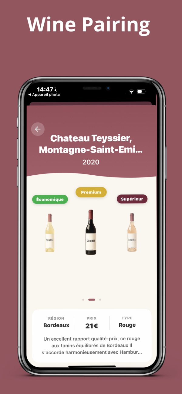 SOMMIA - Your Wine Sommelier Transform your smartphone into a personal sommelier with SOMMIA, the app that makes wine expertise accessible to everyone through artificial intelligence. KEY FEATURES - Snap a photo of your dish = Get 3 perfect wine recommendations - Restaurant wine list scanner: Photo the wine menu + describe your dish = 3 ideal wines from that specific list - AI-powered analysis based on thousands of validated pairings - Smart filtering by budget and preferences - Save your favorite recommendations HOW IT WORKS 1. Take a photo of your dish OR the restaurant wine list 2.