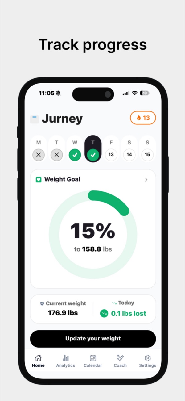 HOW TO USE JURNEY: 1) Answer weight questions to build your plan 2) Log Your Weight daily 3) Get personalized weight loss analytics to track progress. 4) See your journey on the Progress Calendar across days, months, and years. 5) Review past logs on specific days to remind yourself how far you’ve come.