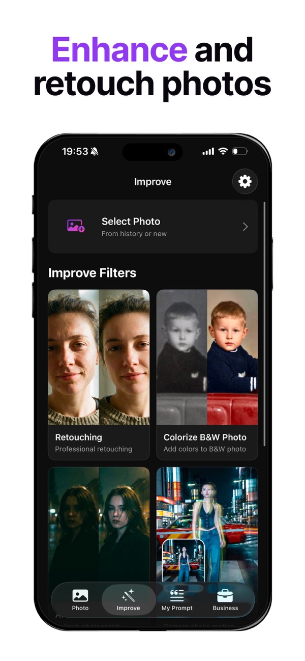 Transform your photos into stunning AI-generated art with AI Photo Editor! KEY FEATURES: • AI Image Generation - Create unique images from your photos in seconds • Photo Enhancement - Retouch, colorize, and improve your photos instantly • Professional Tools - Product photography, logo design, and creative ads • 50+ AI Styles - From vintage to fantasy, anime to cinematic • Custom Prompts - Full control over your creative vision • Fast & Easy - Generate professional results in 20-40 seconds PERFECT FOR: Photographers, designers, business owners, and creative enthusiasts who want professional-quality results without expensive software. Transform your photos.