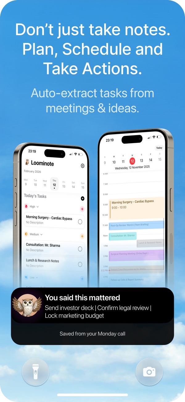 Loominote helps you make sense of everything. Capture voice notes, meetings, random thoughts, scanned documents, PDFs, and text dumps, and turn them into clear summaries, action items, scheduled tasks, and structured plans. This is not just an AI note taker.