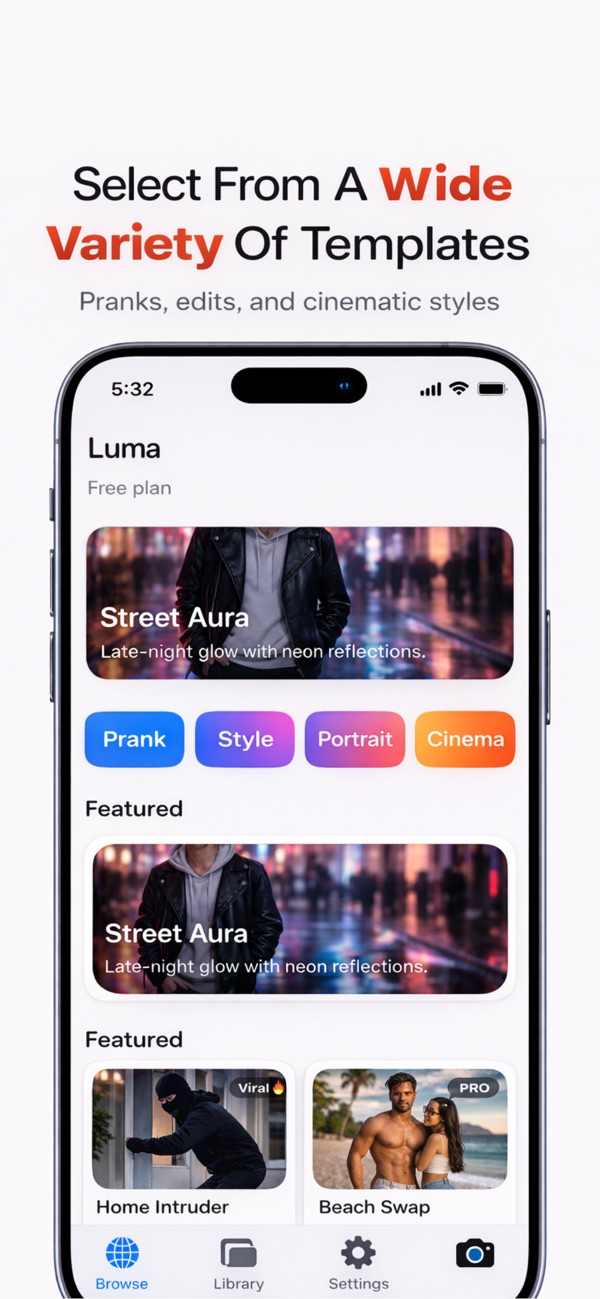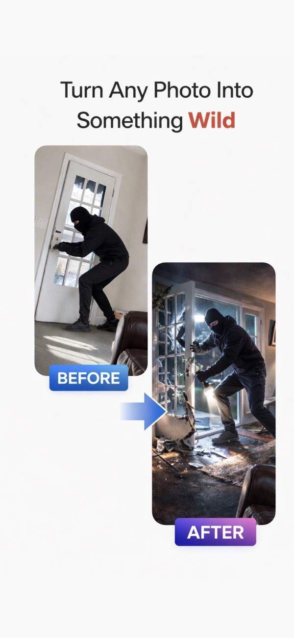 Turn one photo into stunning edits — street style, cinematic flare, prank overlays & more. Upload, describe your look, and generate in seconds. Try Pro free for 3 days.