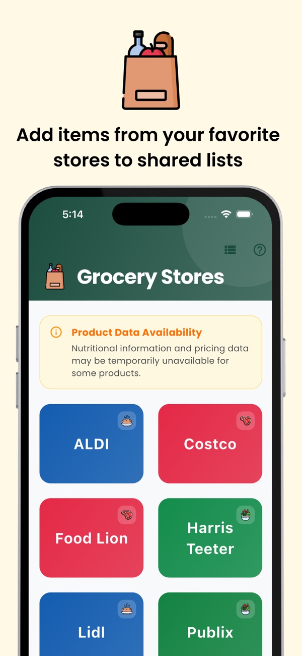 The only grocery list app with real-time prices from 12+ major stores. Create grocery lists with live pricing from Walmart, Target, ALDI, Costco, Publix, Harris Teeter, and more. Sign in with Google, track spending, and stick to your budget - whether shopping solo or with others.