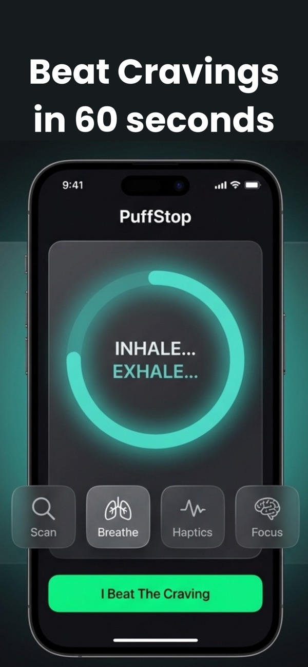 PuffStop is your personal companion on the journey to quit smoking and vaping. With a unique blend of proven techniques and engaging features, we help you break free from nicotine addiction while celebrating your progress. KEY FEATURES: GUIDED EXERCISES & ACTIVITIES • Personalized breathing exercises for stress relief • Quick 1-minute stretches to beat cravings • Progressive muscle relaxation techniques • Guided meditation sessions • Customizable exercise duration • Track effectiveness of each activity • Save your favorite exercises for quick access SAVE MONEY • Real-time savings calculator • Watch your money grow instead of going up in smoke • Daily, weekly, and monthly savings reports PERSONALIZED QUIT PLAN • Custom plan based on your smoking/vaping habits • Daily tasks and milestones • Flexible approach - gradual reduction or cold turkey • Adjustable based on your progress • Progress tracking and adjustments TRACK YOUR PROGRESS • Days smoke-free counter • Money saved calculator • Cigarettes/vapes avoided tracker • Beautiful progress visualizations • Craving intensity tracking • Exercise effectiveness ratings • Detailed statistics and insights CELEBRATE SUCCESS • Milestone celebrations • Achievement badges WHY CHOOSE PuffStop?