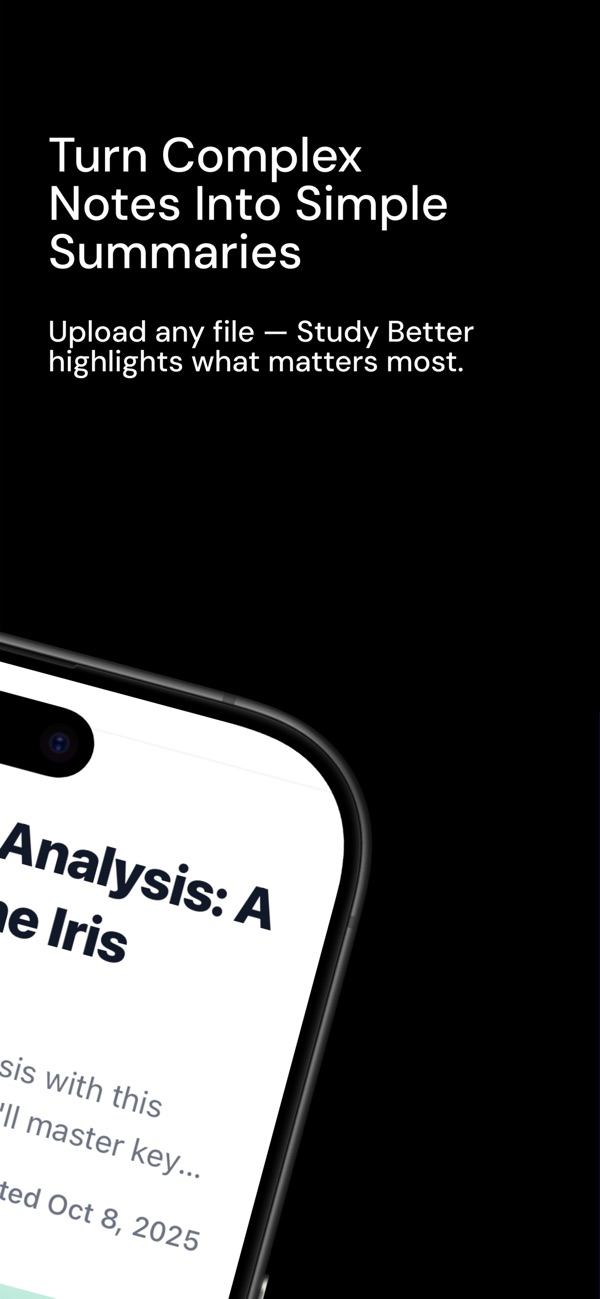 Turn PDFs, class notes, images, and voice memos into study tools you can use right away. Study Better turns one upload into AI summaries, flashcards, quizzes, and active recall practice for exam prep, homework, and daily revision. What you can do in Study Better • Upload PDFs, photos, and voice recordings in one place • Get AI summaries that pull out the key ideas fast • Generate flashcards with spaced repetition for better recall • Practice with quizzes built from your own material • Explain concepts out loud with Explain Mode for active recall • Organize each subject inside focused study boards Built for real study sessions • Review lecture material before exams • Turn messy notes into clear revision • Study from voice memos when you do not have typed notes • Keep summaries, quizzes, and flashcards connected to the same source material Learn faster, stay organized, and turn your own material into study tools that help you remember more.