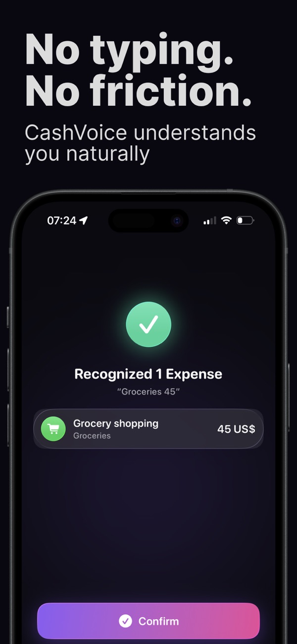 CashVoice lets you log spending just by speaking. Say something like “Coffee $5, lunch $12” - the app instantly understands the amount, category, and details using AI. No typing.