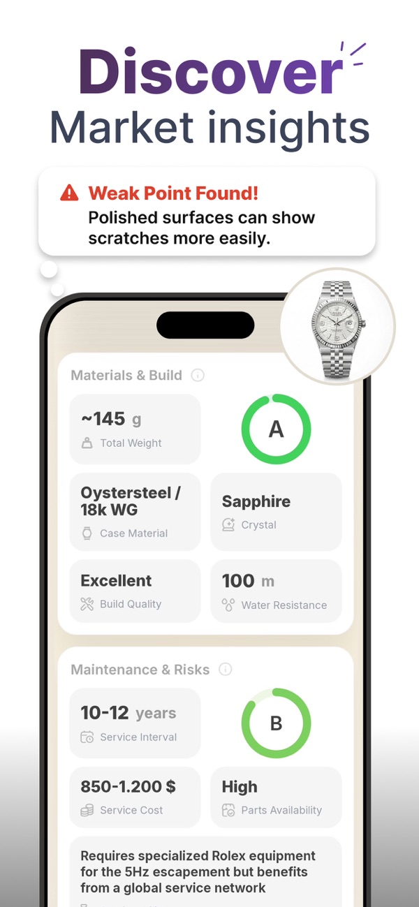 Scan, identify, and estimate your watch’s value. Get insights on materials and movement, compare price ranges, and build a private library. Discover watches with WatchScore, the AI watch identifier and value guide.